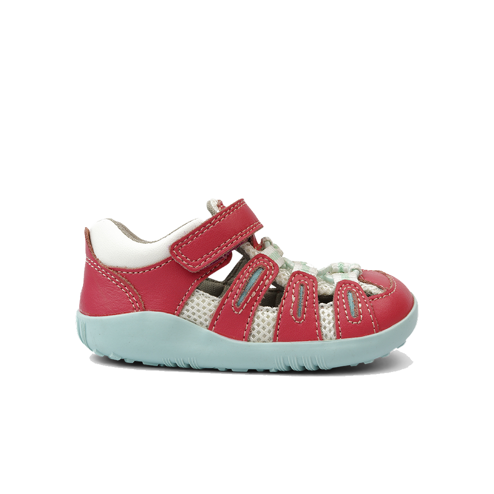 The Summit is our new action sandal ideal for all terrain adventures. In a bold guava and mist colourway, the Summit features bungy elastic that accommodates different foot widths and extra flexibility, with soft microfibre overlays for comfort. A hardwearing Aktiv sole and water-friendly leather provide durability for summer exploration, while an adjustable ankle strap and padded collar keep feet secure and supported. Suitable for first walkers, this style fits true to size.