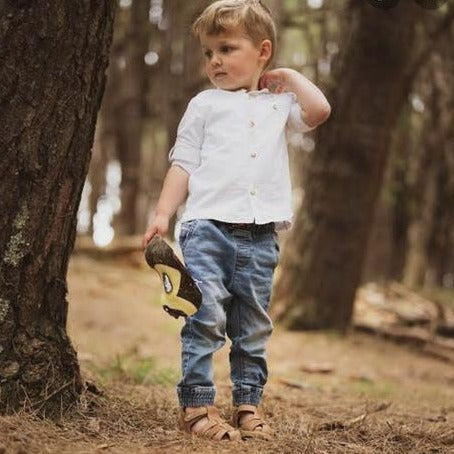 This classic summer sandal has a closed toe for added protection, while open sides provide airflow and breathability. In a unique caramel colourway, this sandal makes an elegant addition to any outfit - from school uniforms to their Sunday best. The Roam sandal boasts an ankle strap fastening for a secure, adjustable fit, padded collar for comfort and our signature brass icon rivets add sophistication. Suitable for active kids, this style fits average width feet, and is true to size. Adjustable around ankle. Fits average width feet. Standard length.