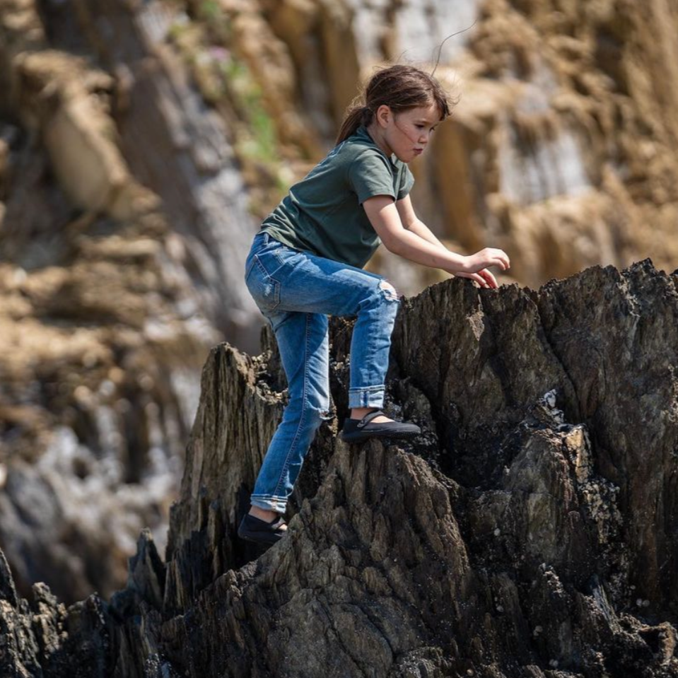 The Kids Multi-terrain Sole is designed for ultimate flexibility, toe protection and ground feel for fast growing feet. The 2mm base and 2mm sticky rubber hexagon design allows for wild feet to feel the ground and move naturally.